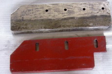 刮板是一种给煤机箱体内用于刮煤的装置,它包括有骨架和与之垂直方向一体连有的两个翅板,翅板背部一体设计有加强筋,在翅板与骨架连结部位的加强筋两侧设计有过渡面。过渡面与翅板的角度在20°-45°间。由于在翅板背面增加了加强筋板和翅板根部与骨架连结部设计有过渡面,有效增加了翅板的强度和刚度,提高了刮板的使用可靠性。该装置结构简单、铸造方便、成本低廉、经久耐用,可广泛应用于电力、煤矿上的原煤输送设备上。